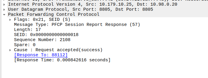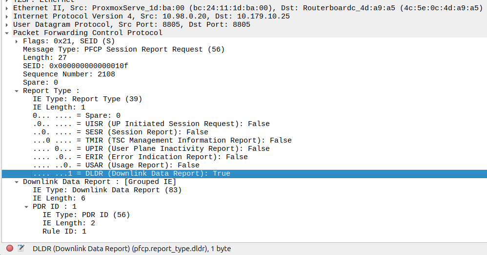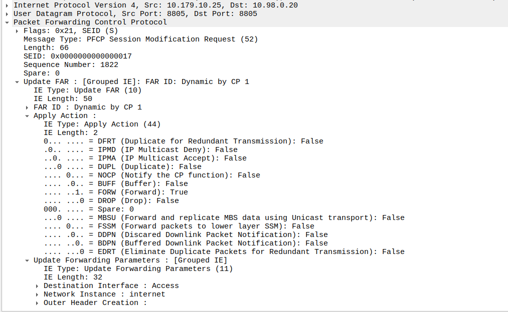 Once the UE has become reachable, the Control Panel needs to modify the bearer to turn back on forwarding. It does through another Session Modification Request, this is the inverse of the one it sent to turn on buffering, as we’re turning off buffering and notifications, and turning on forwarding.