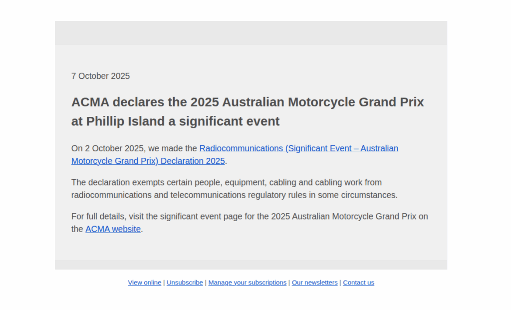 I got this email today from ACMA, the Australian communcations regulator who’s mailing list I subscribe to: