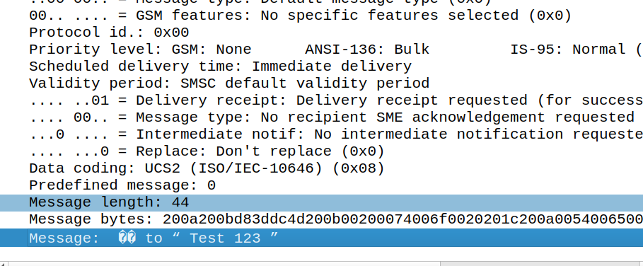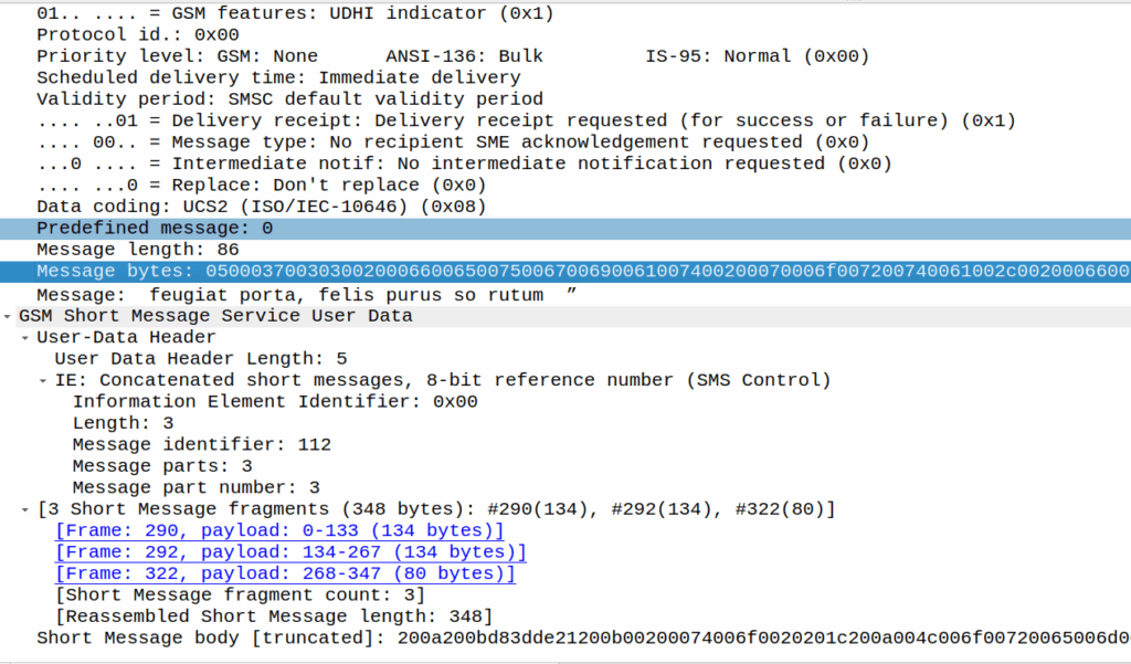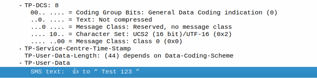 In this case, this ends up being a 3 part message, the original text has almost doubled in size as it’s now in UTF16 – it was 140 bytes before (140 bytes fits 160 GSM7 characters) but is now 320 bytes (140 characters at 8 bytes each) + the 8 bytes for the hair space + whitespace + 8 more bytes for the emoji + the 6 bytes UDH header per message, brings us to a whopping 347 bytes not including overhead.