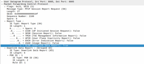 Once the UE has become reachable, the Control Panel needs to modify the bearer to turn back on forwarding. It does through another Session Modification Request, this is the inverse of the one it sent to turn on buffering, as we’re turning off buffering and notifications, and turning on forwarding.